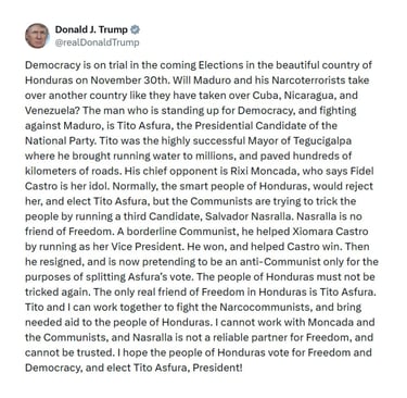 In the 2025 election, the conservative National Party of Honduras (PNH) defeated the LIBRE Party and Liberal Party in order to take control over the national government. The new Honduran President-elect Tito Asfura was endorsed strongly by President Donald Trump, opening the door for a new era of cooperation between Honduras and the U.S.